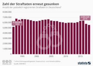 Correspondingly, the „Aufklärungsquote“, or crime clearance rate, rose to an all-time high in 2018 of over 50%. Just to remind you: Chicago’s police only manages to solve 14% of homicides. In Germany the rate last year was 95.3%! German policemen always catch their man (or woman)!