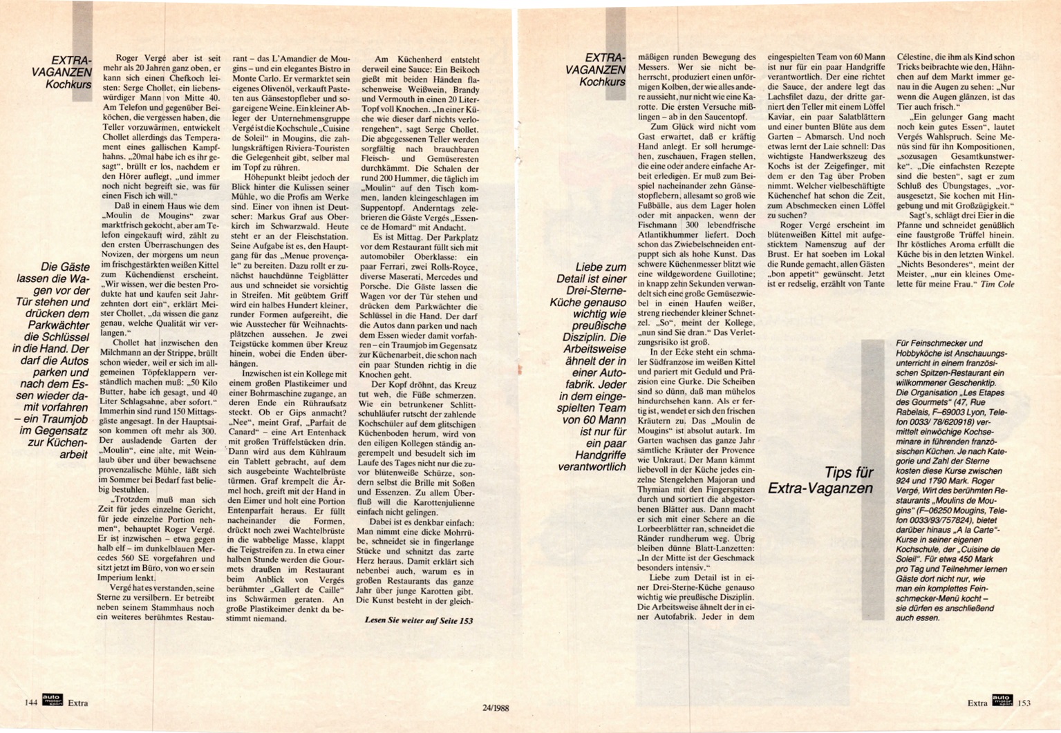 Covid lässt mir gerade sehr viel Zeit, in Erinnerungen zu kramen. Im Lauf meiner 50 Journalistenjahre habe ich großartige Menschen begegnen dürfen und über sie Artikel schreiben, die in verschiedenenn Zeitungen und Zeitschriften erschienen sind. Die meisten von ihnen verstauben seit Jahrzehten in irgendwelchen Ordnern, aber ich dachte, ich nehme mir mal die Zeit, ein paar besonders wertvolle (jedenfalls für mich), die vielleicht auch noch Relevanz für die Leser hier im Cole-Blog sein können, zu digitalisieren und zu präsentieren. Heute: Wie ich 1988 (!) bei einem der größten Köche der Welt, der leider nicht mehr lebt, in der Küche stehen und mit ihm sogar Sossen abschmecken durfte. Zum Mitkochen haben meine bescheidenen Fähigkeiten aber nicht gereicht. Dafür durfte ich zusehen, wie man Kunst auf den Teller zaubert.