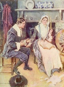 „Gehe zur Jungfrau Priscilla (allez tres vite chez Priscilla), das hübscheste Mädchen von Plymouth (la plus jolie demoiselle de Plymouth). Sag ihr, dass ein ungehobelter alter Kapitän, ein Mann nicht der Worte, sondern der Tat (un vieux Fanfan la Tulipe), ihr seine Hand und sein Herz, die Hand und das Herz eines Soldaten, zu Füssen legt. Nun, sag’s nicht genau so, aber du weißt schon, was ich meine…“