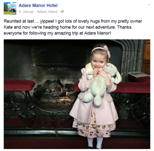 Das Adare Manor hat eine Facebookseite, was an sich schon verwundert, denn die Queen wäre vermutlich darüber not amused. Umso überraschter war ich, als ich dort diese wunderbare Geschichte vom Stoffhäschen las.