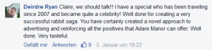Ich weiß nicht, ob im Adare Manor ein besonders gewiefter Mitarbeiter an der Rezeption saß oder ob irgendjemand in der PR-Abteilung viel auf Facebook unterwegs ist. Was jedenfalls dann geschah sollte in einem Lehrbuch für Social Media Marketing stehen, denn das kleine Häschen begann sich selbständig zu machen und wurde zum Thema einer fast perfekten viralen Kampagne.