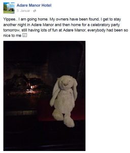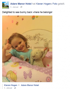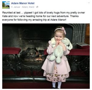 Das Adare Manor hat eine Facebookseite, was an sich schon verwundert, denn die Queen wäre vermutlich darüber not amused. Aber umso überraschter war ich, als ich dort diese wunderbare Geschichte vom Stoffhäschen las.