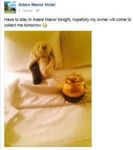 Das Häschen wurde zum Held einer rührenden kleinen Geschichte. Das nächste Foto zeigt ihn im Gästebett, die TV-Fernbedienung in der Hand, neben sich eine Praline als kleines Betthupferl. Darunter der Text: „Ich muss heute Abend im Adare Manor übernachten. Hoffentlich werde ich morgen abgeholt.“