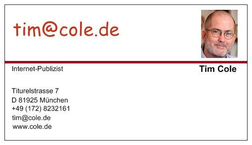 Damit müsste man doch was machen können. Ich bin aber noch ein bisschen unentschlossen. Soll ich mixh in „Tim Cole.de“ umtaufen lassen. Oder wie wär es denn, wenn ich gleich meine E-Mail-Adresse als Namen annehmen würde. „tim@cole.de“ hat doch was. Steht ohnehin auf meiner Visitenkarte, ich müsste nicht einmal neue drucken lassen.