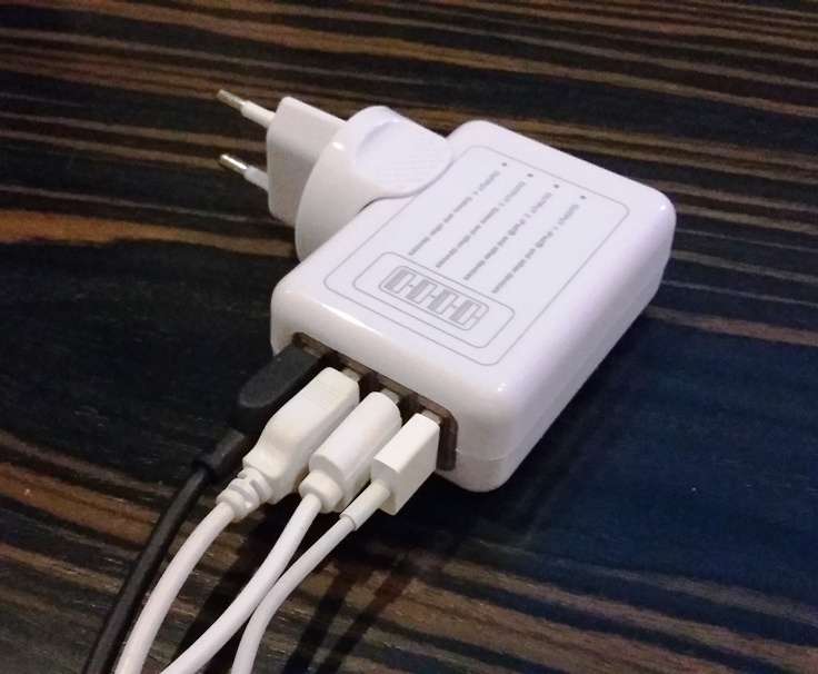 Ich habe das ideale Zubehör für Gadget Man im Bordshop von Air Lingus gefunden: ein Vierfach-USB-Adapter. Damit kann ich alle meine Mobilgeräte gleichzeitig aufladen!