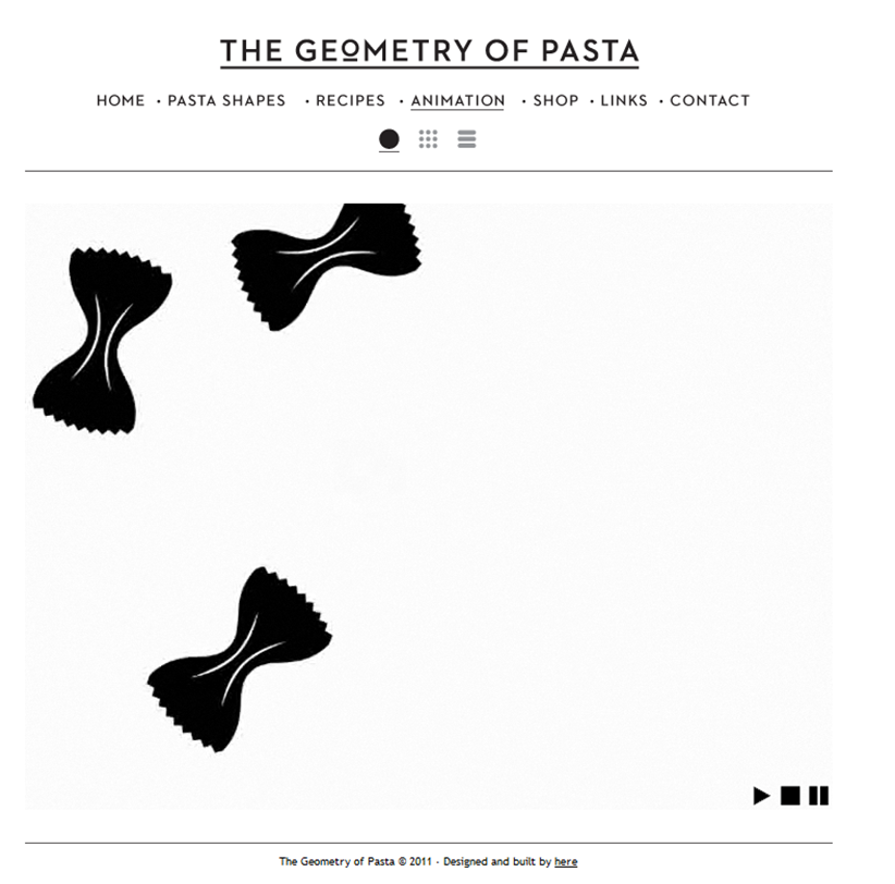 Auf der Homepage von The Geometry of Pasta von Star-Designer Caz Hildebrand und Jacob Kennedy vom Londoner Gourmetrestaurant Bocca di Lupo zum Beispiel flattern Farfalle wie leibhaftige Schmetterlinge über den Bildschirm. Per Mausklick gelangt man dann zum passenden Rezept, zum Beispiel Coniglio all’ischitana (einer meiner italienischen Lieblingsessen!). Ziel des Ganzen ist es angeblich, „die Wissenschaft, Geschichte und Philosophie hinter den spektakulärsten Pasta-Gerichten aus ganz Italien zu offenbaren“, wie die Autoren in nicht gerade typisch britischem Understatement behaupten.