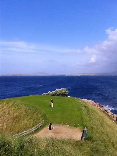 Und dann stehst du am siebener Loch und weißt, warum Cruit Island in einem Atemzug mit Pebble Beach genannt wird. Denn hier stehst du beim Abschlag auf einer Klippe, die auf allen Seiten vom Meer umspült ist, und schaust hinüber aufs nur 137 Meter entfernt Grün. Dazwischen durchspülen die Atlantikbrecher eine schwarze, zackige Felsenschlucht, und denkst dir: „Da kommt doch kein Mensch drüber!“ Du schlägst ab, der Ball fliegt wunderbar und kerzengerade – bis ihn die steife Meeresbrise packt und unaufhaltsam nach rechts schiebt, wo er in den tosenden Fluten versinkt.