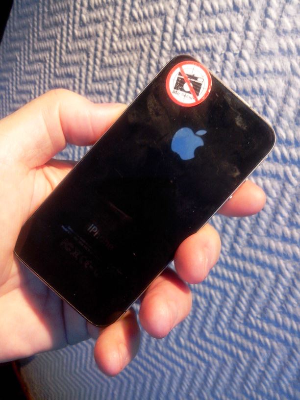 Aber der freundliche Pförtner wollte mein iPhone gar nicht einsperren – sondern nur unschädlich machen. Und das ging ganz einfach: Er griff in die Schublade, holte einen Bogen kreisrunder Klebeetiketten heraus, nahm eine runter und pappte sie über die Linse. Dann gab er mir das Gerät zurück.