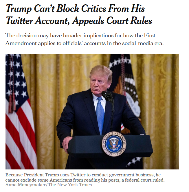 Das hat nichts mit privater Online-Plauderei zu tun, das ist dienstlich! Das fand jetzt auch ein Bundesrichter in New York, der laut New York Times am Dienstag entschied, dass Trumps Tweets öffentliches Eigentum sind. Der Tweeter-in-chief hatte nämlich Leute, die es gewagt hatten, seinen Online-Botschaften zu widersprechen oder ihn zu kritisieren, kurzerhand ausgesperrt. Eigentlich ein ganz normaler Vorgang, oder? Alle Social Media Plattformen bieten auf die eine oder andere Weise eine Blockadefunktion gegen unliebsame oder nervende Zeitgenossen an.