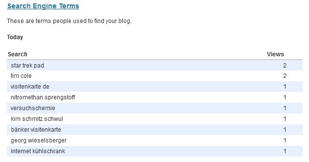 Ich habe neuerdings eine tolle Auswertungs-Software auf meinem Blog installiert der mir unter anderem sagt, wie Leute zu mir gefunden haben. Neulich habe ich von dem Typen berichtet, der über „Obama ist ein stinkender Neger“ ausgerechte auf meinen Blog kam. Im Interesse der Internet-Forschung werde ich in Zukunft ab und zu die neuesten Suchbegriffe posten, weitgehend kommentarlos. Soll sich jeder selber seinen Reim darauf machen, was die Menschen so alles bei Google & Co. eintippen.