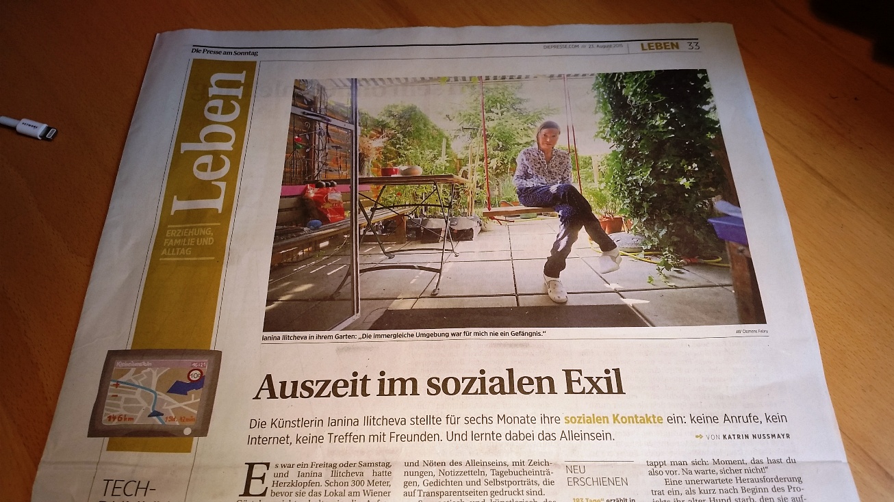Ianina Ilitcheva heißt sie und gibt als Berufsbezeichnung „Künstlerin“ an. Sie hat sogar ein Buch darüber geschrieben, das sie „183 Tage“ nannte und in dem sie auf sage und schreibe 288 Seiten von – ja wovon denn: eigentlich von nichts, also dem Fehlen von etwas, nämlich der sozialen Kommunikation – erzählt. Angeblich wollte sie herausfinden, aus welchen Quellen sie ihre Inspiration schöpfen würde, wenn sie den Kontakt zur Außenwelt abstellt. „Für mich war die wichtigste Frage: Brauche ich für meine Arbeit Einflüsse von außen, oder hab ich so viel in mir angesammelt, dass ich daraus schon etwas machen kann?“