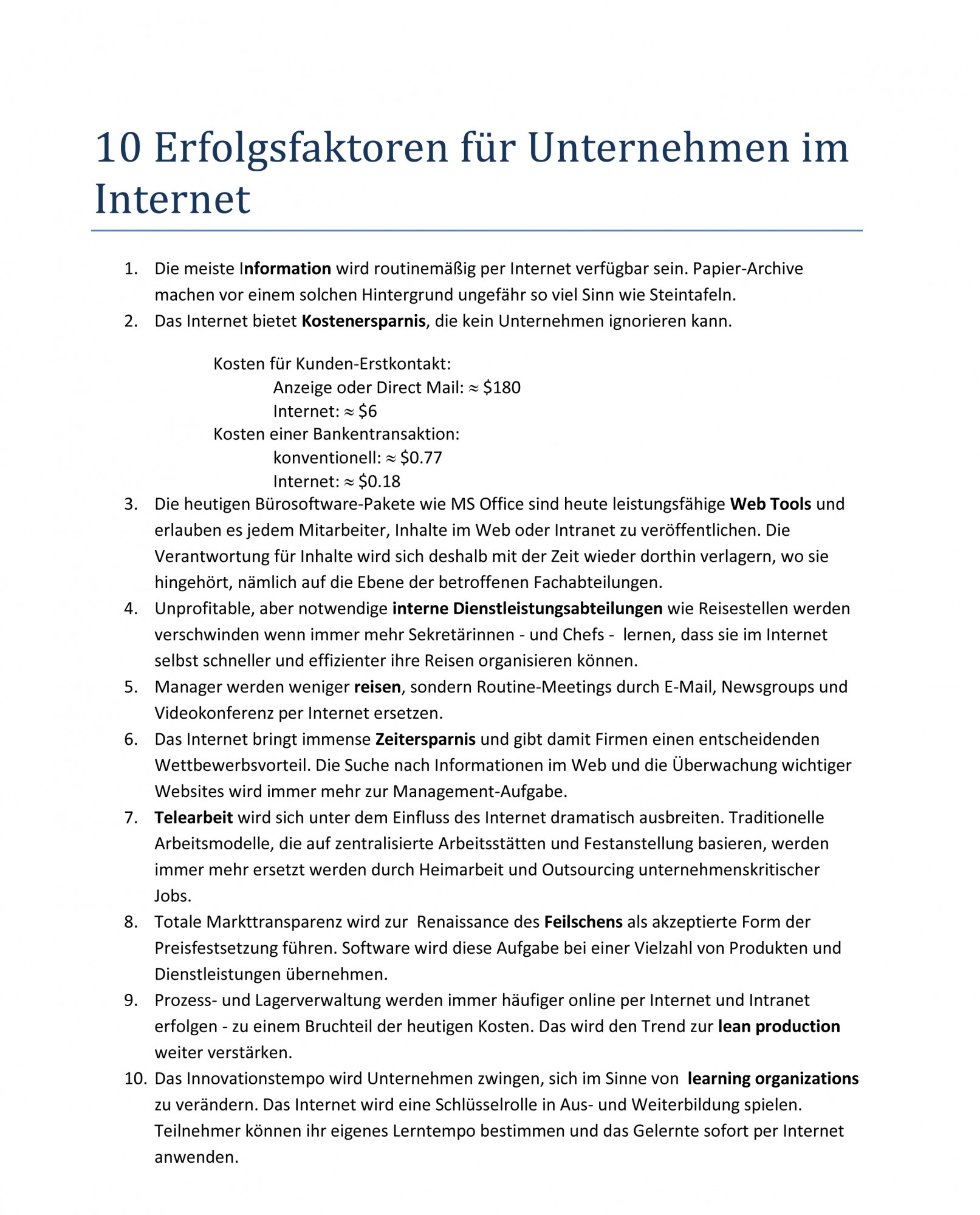 Aber in der Materialsammlung für das nie geschriebene Buch fand ich diese Liste von „10 Erfolgsfaktoren für Unternehmen im Internet“, die ich im Jahre des Heils 1998, also vor 16 Jahren (und lange vor dem Platzen der Dotcom-Blase!) zusammengestellt hatte. Und die, wie ich finde, auch heute noch ganz gut als Leitfaden für Manager dienen könnte, die nicht ganz genau wissen, was sie mit diesem ganzen Internet-Gedöns sollen. Und davon gibt es leider auch im Jahre des Heils 2014 noch eine ganze Menge…