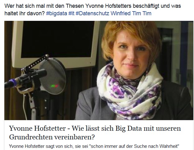 Oliver Marquardt aus Marburg, der sich selbst als „Marketingphilosoph“ (guter Titel!) bezeichnet, hat auf Facebook einen Link zu Deutschlandradio Kultur gepostet mit einem Interview mit Yvonne Hofstetter, Geschäftsführerin der Teramark Technologies GmbH und Autorin von „ Sie wissen alles“, ein lesenswertes Buch mit dem provokanten Untertitel „Wie intelligente Maschinen in unser Leben eindringen und warum wir für unsere Freiheit kämpfen müssen“. Die studierte Juristin ist keine Maschinenstürmerin, aber sie stellt kluge Fragen darüber, wie Menschen und Maschinen miteinander friedlich koexistieren und welche Gefahren aus einer übergroßen Abhängigkeit von Algorithmen entstehen können.